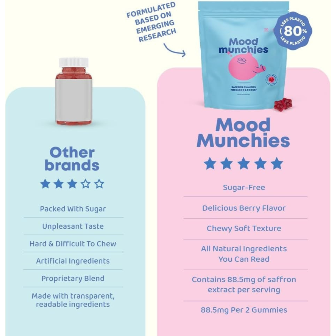 ⥠A True Mood Powerhouse â Mood Munchies go beyond just saffron. These sugar-free, berry-flavored gummies are packed with saffron plus passionflower, GABA, and St. Johnâs Wort to create a powerful mood-supporting blend.